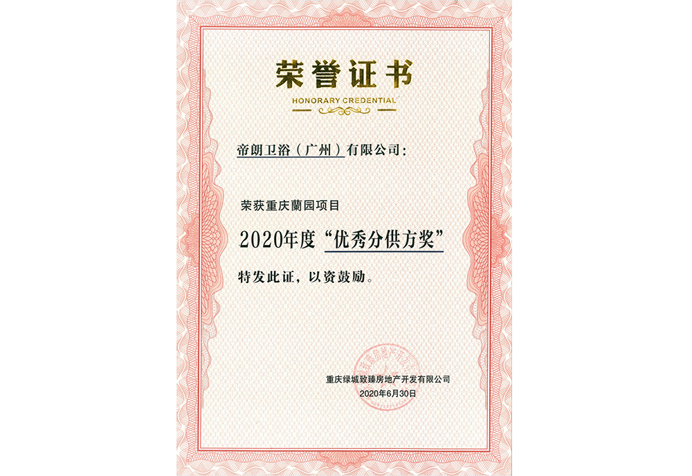 此外,在区域项目上,帝朗卫浴荣获得重庆兰园项目2020年度”优秀分供方奖“