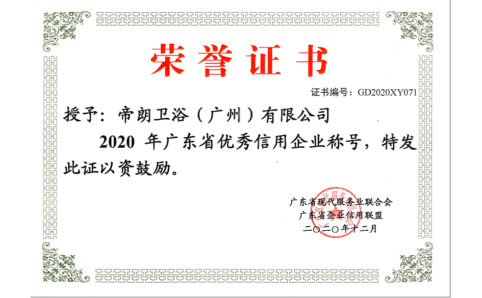 日前,由广东省现代服务业联合会、广东省电子商务协会等联合主办评选的“2020年广东省优秀信用企业和广东省信用标杆企业”名单揭晓。凭借优秀信用和卓越的品牌影响力,帝朗卫浴获评“2020年度广东省优秀信用企业” 荣誉称号。
