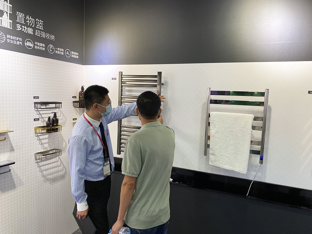 此次展会,帝朗卫浴展示的产品包含浴室挂件、水龙头、花洒、智能马桶、电热毛巾架等,全方位展示卫浴空间。