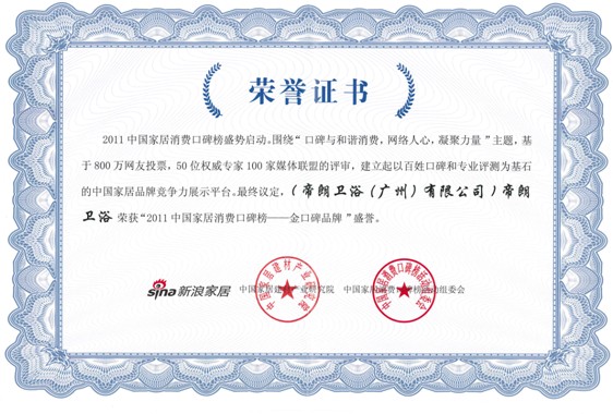 2011年12月,第二届中国家居建材口碑榜暨2011新浪家居建材产业创新峰会在北京·人民大会堂隆重召开。凭借消费者对帝朗优质产品的认可,帝朗荣获“2011中国家居消费口碑榜--金口碑品牌”荣誉。获此荣誉,是消费者对帝朗产品品质的权威验证,更是消费者对帝朗的信赖。