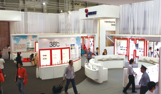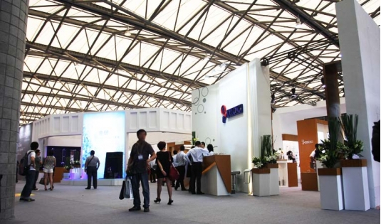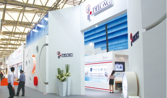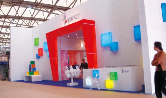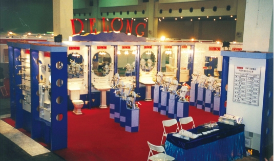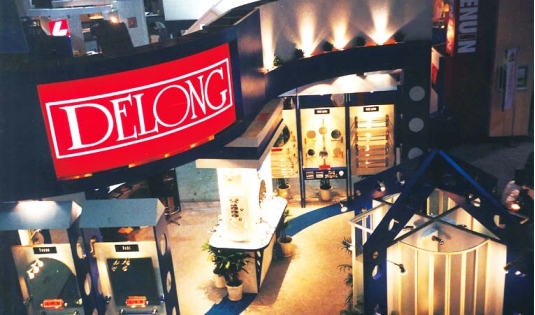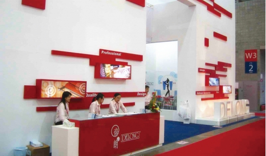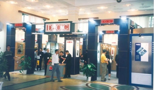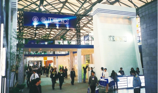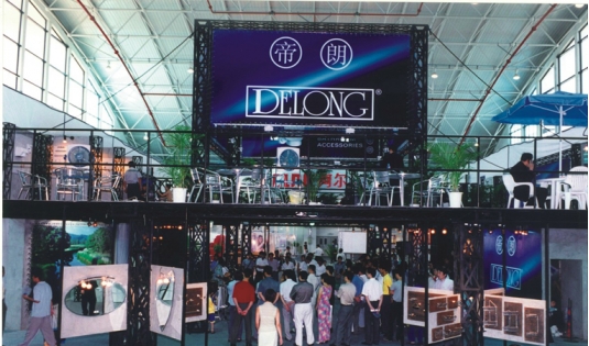 2001年,帝朗上海厨卫展的形象一改以往风格,以黑色桁架为主架构,蓝色广告为辅,采用上下复式结构,营造出时尚感十足的展厅,以匹配帝朗时尚产品的定位。二层的洽谈区,采用玻璃桌、绿色植物等元素,给人时尚舒适的生活感觉。