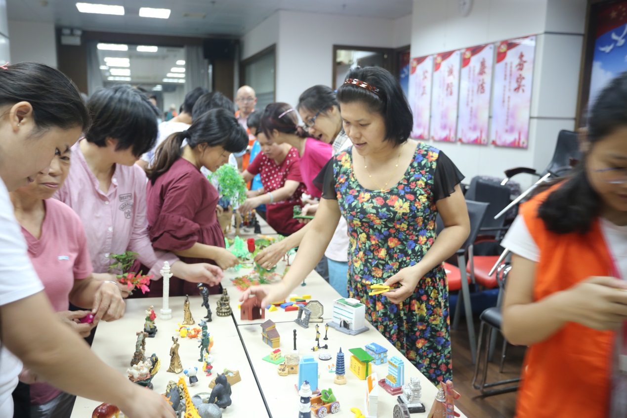 上图:妈妈们挑选沙具 摆出自己心中的故事