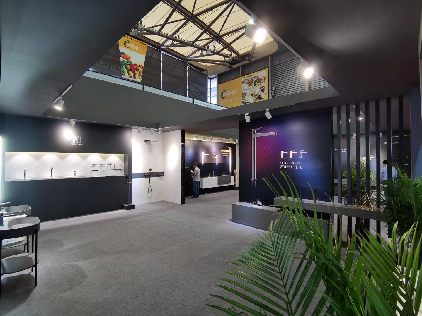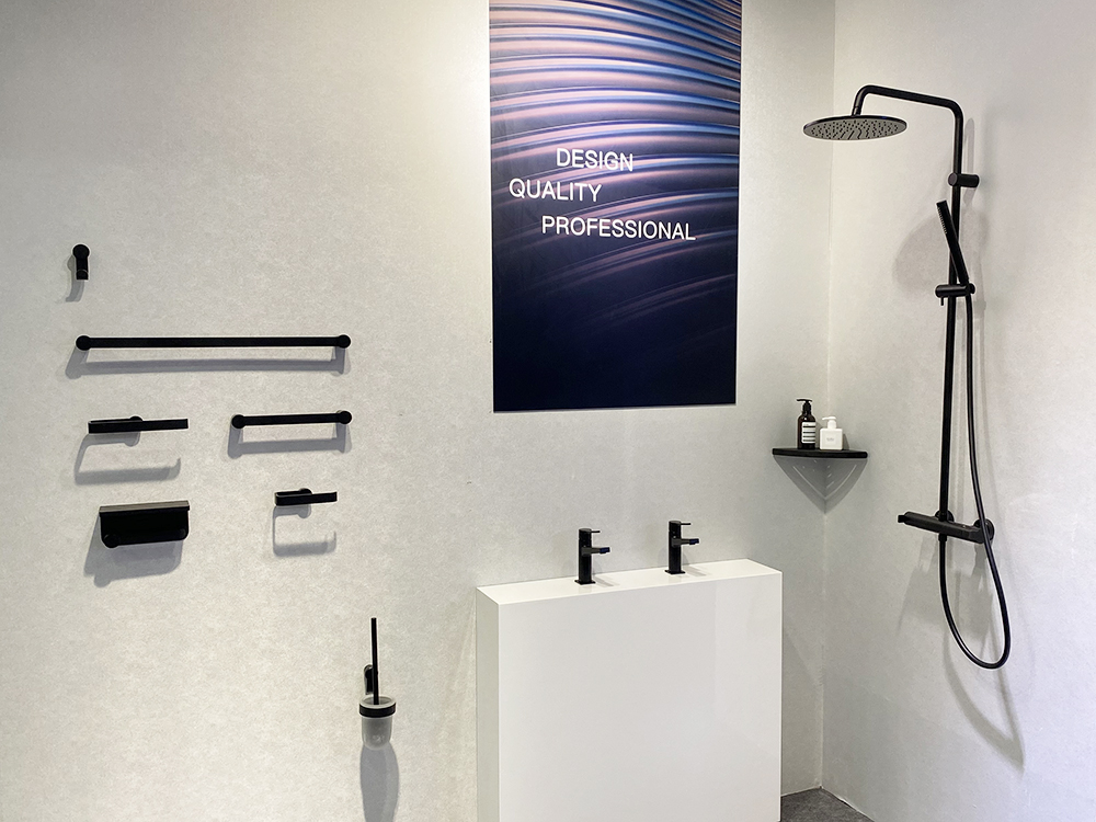 作为29年深耕卫浴五金的品牌,帝朗卫浴在展馆的设计上别具匠心。整体以经典黑白灰为主色调,营造质感空间。
