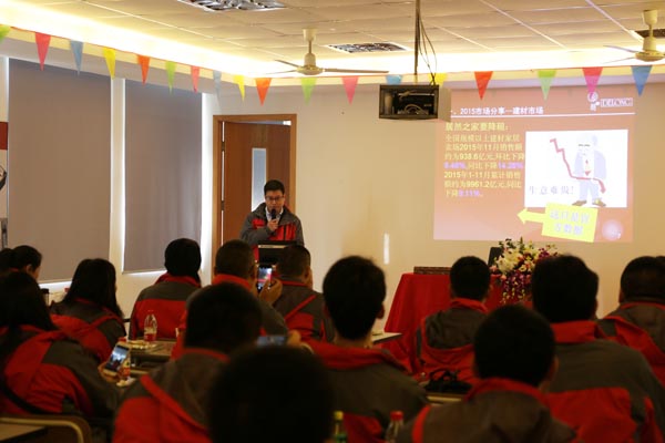 在销售会议室,帝朗销售副总丁先生为经销商阐述2016年市场发展趋势,新市场新需要,必定会形成一个新格局,抢占市场,需要贴合市场的新品,更需要有精明的销售政策。